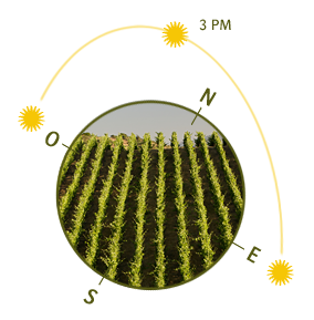 Al mismo tiempo, la totalidad de las hileras -sin importar su pendiente – están plantadas de nor-nor-oeste al sur-sur este, para de esta forma impedir que durante las horas de mayor calor, el sol ilumine de forma directa los racimos. Así se evita la quemadura y deshidratación de la fruta.